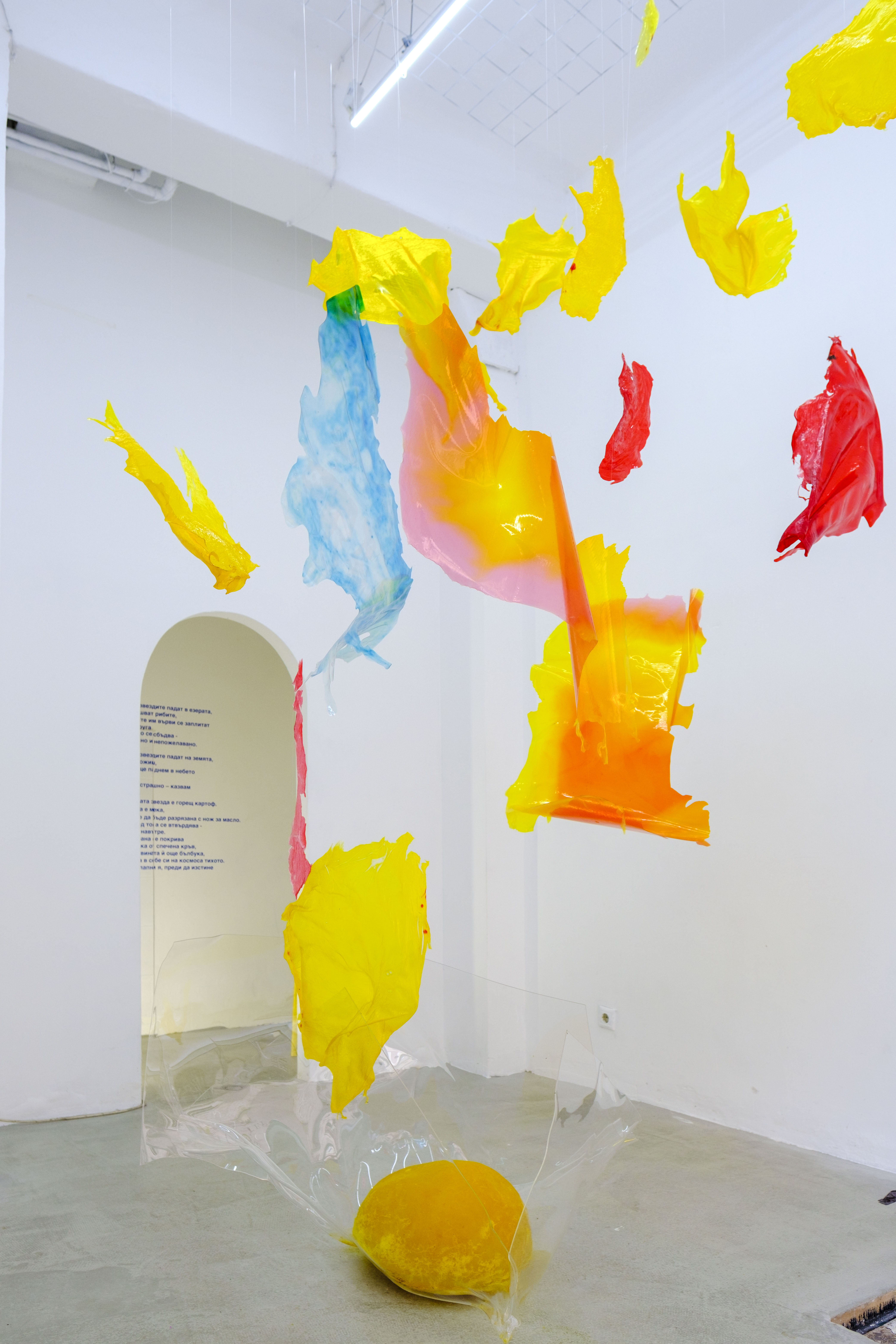 In the exhibition Eternal Return, artist Kalina Dimitrova creates a spatial interpretation of a poem by Aleksandar Gabrovski out of gelatin. The text marks the life path of a shooting star in the earth's solid, as if it were not a cosmic body, but a living tissue, a victim of its own collapse. Its vitality, its warm core, we recognize in the choice of material for Kalina's works - entirely made of organic matter, in the process of slow transformation.